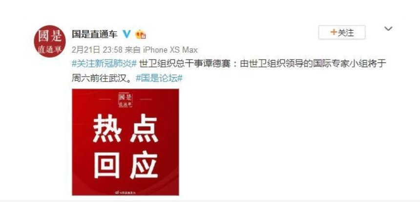 世卫组织总干事谭德赛:由世卫组织领导的国际专家小组将于周六前往武汉。