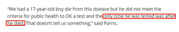 市长在讲话中提到:“我们有一位17岁的少年因病去世,但他因为‘不符合要求’没有得到检测机会,他唯一一次被检测还是在去世后。”