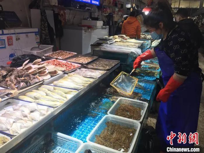 资料图 海鲜店经营人员戴着口罩挑货。 朱俊秀 摄