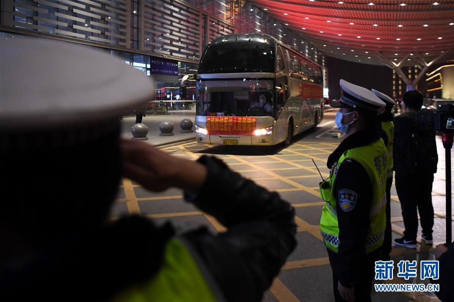 3月17日,抵达湖南长沙南站的湖南支援湖北医疗队队员乘坐大巴车前往隔离点。 新华社记者 薛宇舸 摄