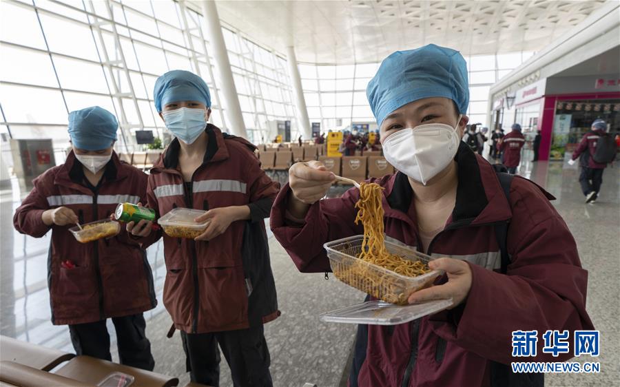 3月18日,在武汉天河机场,福建医疗队队员在享用机场特意准备的热干面。新华社记者 费茂华 摄