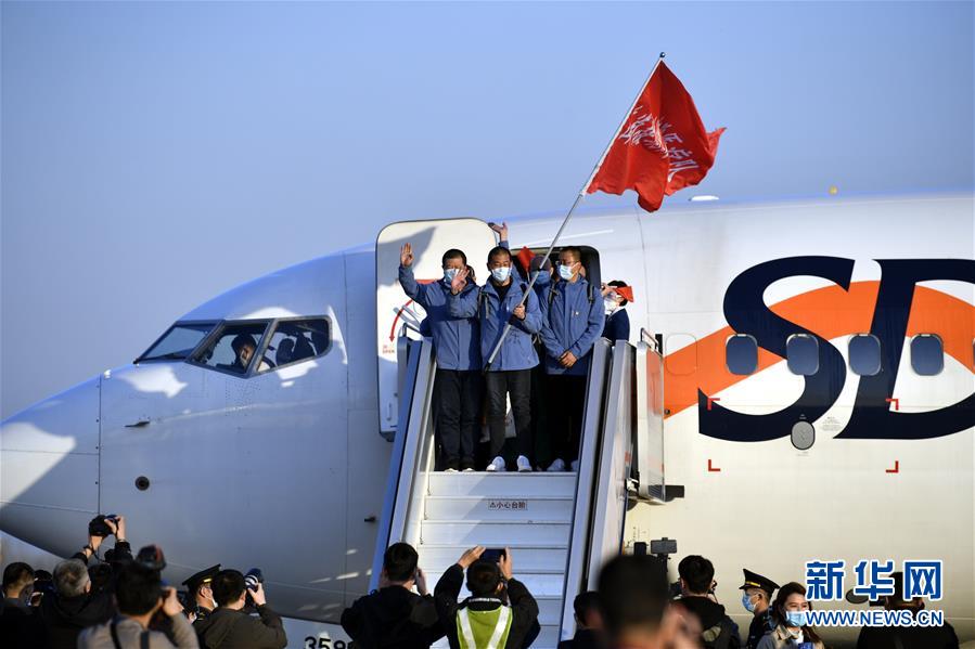 3月17日,山东省援助湖北医疗队队员抵达山东济南遥墙国际机场。 新华社发(饶琦 摄)