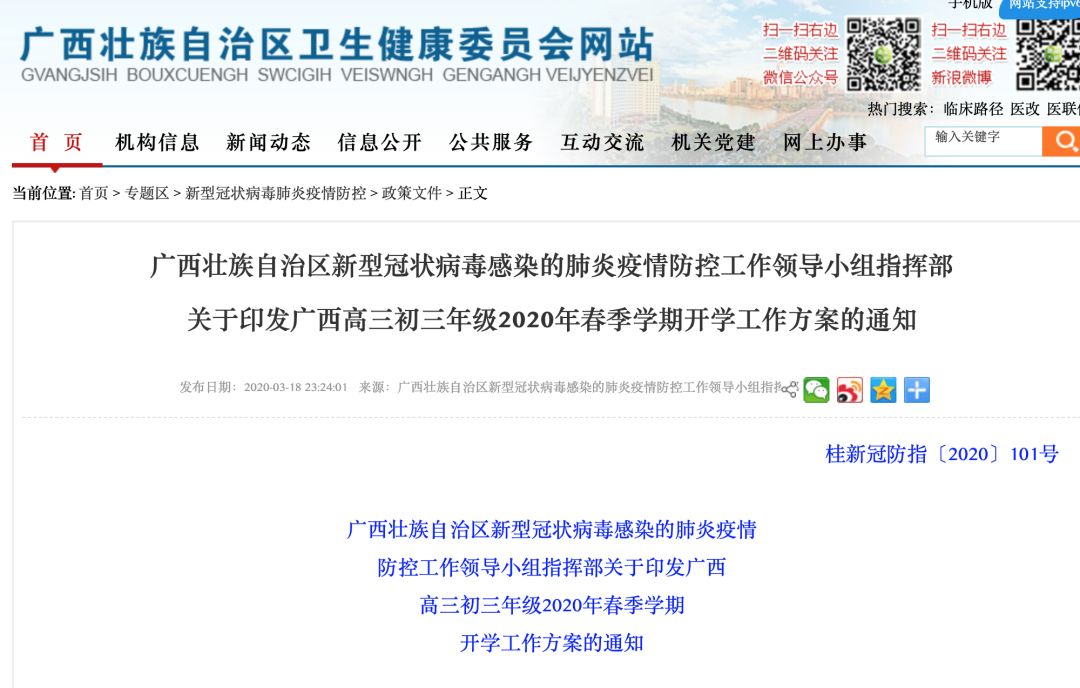 广西壮族自治区新型冠状病毒感染的肺炎疫情防控工作领导小组指挥部18日晚间发布通知,全区高三、初三年级将于2020年4月7日正式开学。