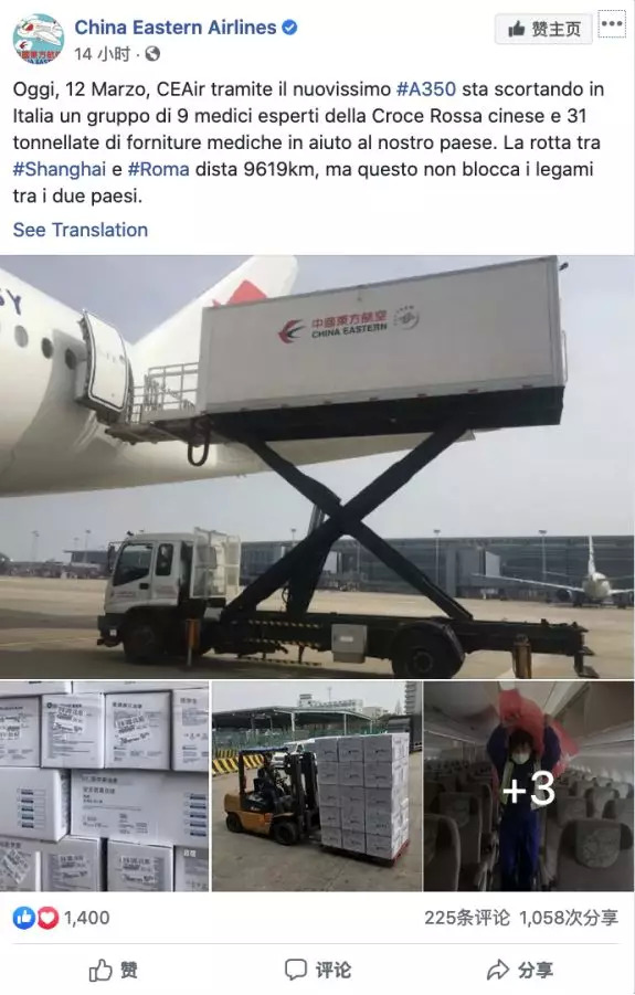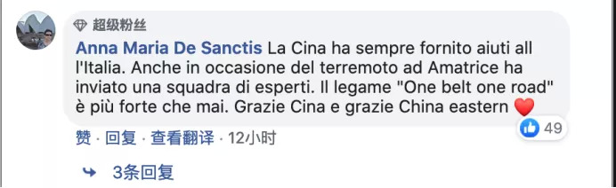 在留言区,一条获赞最多的评论写道:“中国一直向意大利提供援助。即使在(意大利)阿马特里切发生地震的时候,中国也派出了一个专家小组。‘一带一路’的纽带比以往任何时候都更强大。谢谢中国,谢谢东航。”