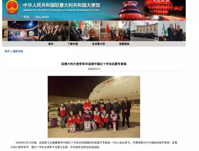 随着新冠肺炎疫情在意大利蔓延,中国在抗击本国疫情的同时,也向这个欧洲疫情最严重国家伸出援助之手。中国援意专家组以及相关物资目前已经抵达意大利,当地时间12日,来自中国的支援力量受到了意大利多个政府部门官员的迎接。此外在社交媒体上,许多意大利网友来到中国使馆的官方脸书主页,纷纷说“Grazie”(意为“谢谢”),比红心向中国人表达谢意。