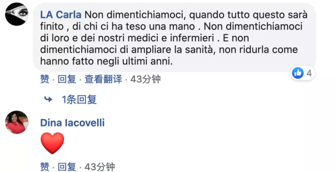 意国内疫情严峻,在得知中国专家组以及大批物资抵达本国后,许多意大利网友纷纷来到中国使馆的脸书贴文下,用自己的方式表达感谢。