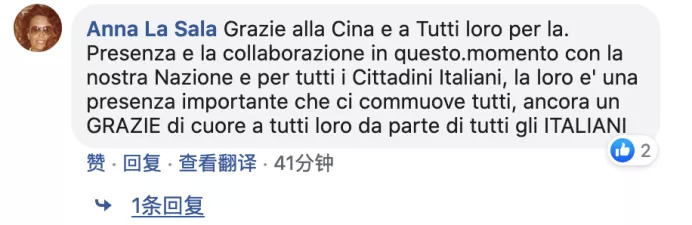 网友Anna La Sala表示,感谢中国,感谢他们所有人的存在以及在这一刻与我们国家的协作。