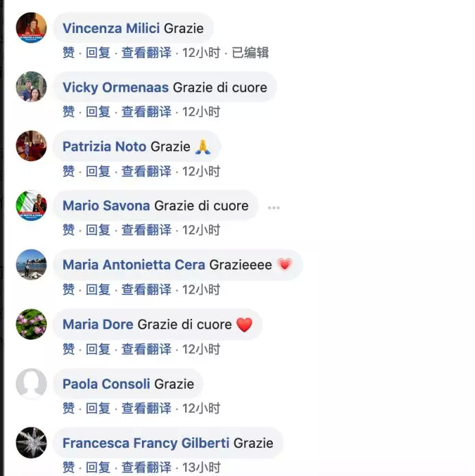 其中能够看到,很多网友说着“Grazie”(意大利语:谢谢)、“谢谢中国”,同时还配有“红心”。