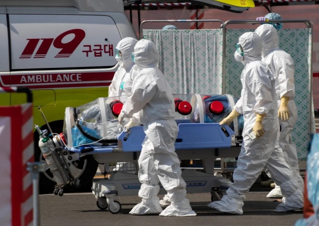 3月4日,在韩国大邱庆北大学医院,医护人员转送患者。新华社发