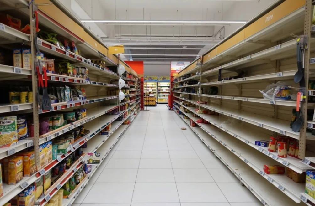 3月5日,在法国巴黎北部一家大型连锁超市,摆放意面和大米的货架剩下零星商品。新华社记者高静摄