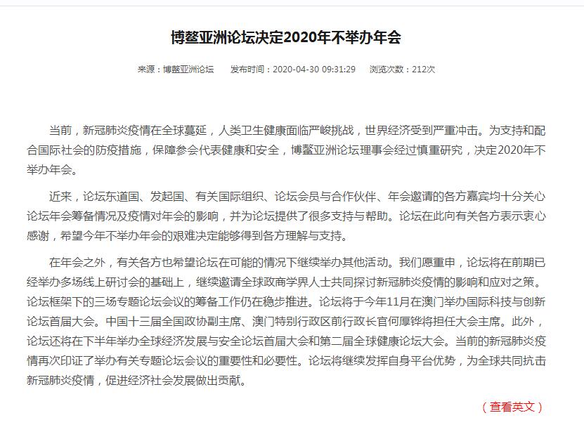 消息指出,当前,新冠肺炎疫情在全球蔓延,人类卫生健康面临严峻挑战,世界经济受到严重冲击。为支持和配合国际社会的防疫措施,保障参会代表健康和安全,博鳌亚洲论坛理事会经过慎重研究,决定2020年不举办年会。