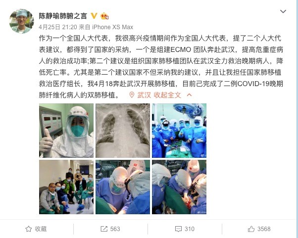 4月25日,陈静瑜在其发表的微博中透露,由他担任组长的国家肺移植救治医疗团队在4月18日奔赴武汉开展新冠肺炎患者肺移植救治工作,此次武汉之行正是上述建议得到采纳。