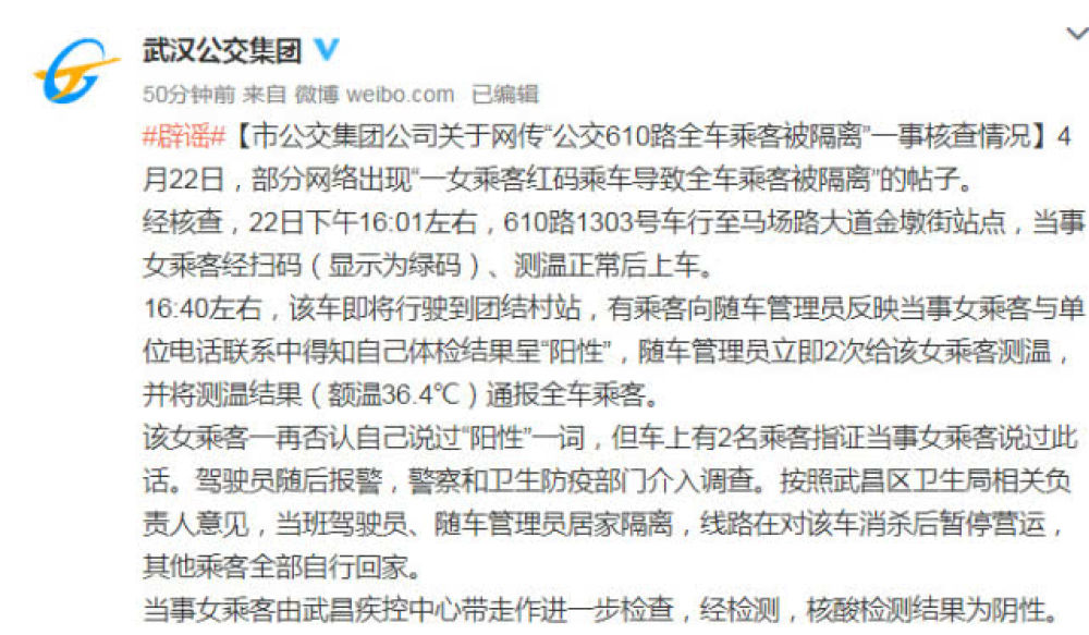 原标题:(武汉)市公交集团公司关于网传“公交610路全车乘客被隔离”一事核查情况