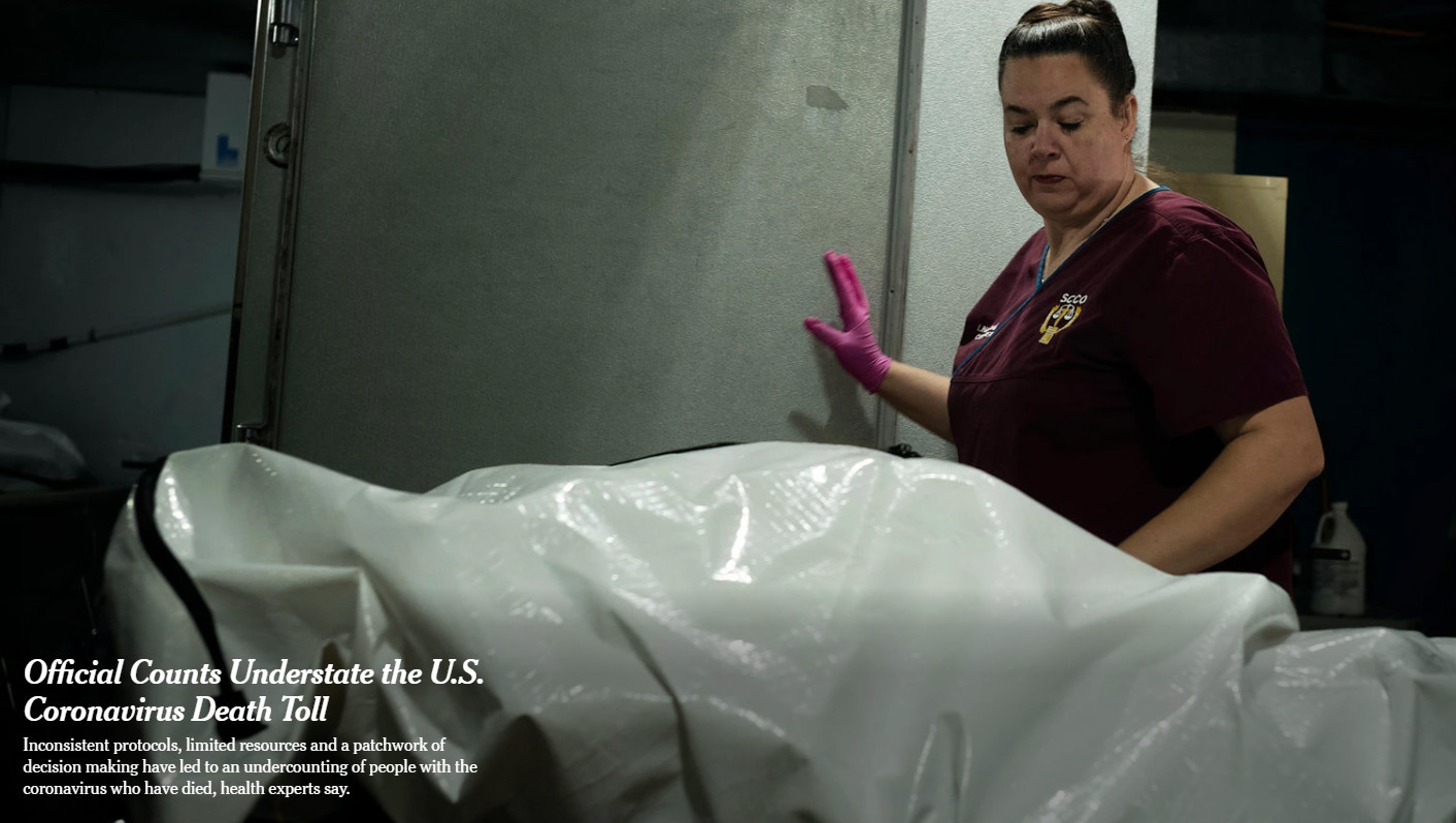 直至今天,由于缺乏统一的新冠肺炎死亡报告系统,加上检测手段持续不足,一些州和县在计算新冠肺炎死亡人数时出现了“随意的、模糊的现象”。针对这一问题,《纽约时报》采访了约翰·霍普金斯大学健康安全中心的高级学者珍妮弗·努佐。努佐表示,可以肯定,一些新冠肺炎死亡人数并未得到统计。