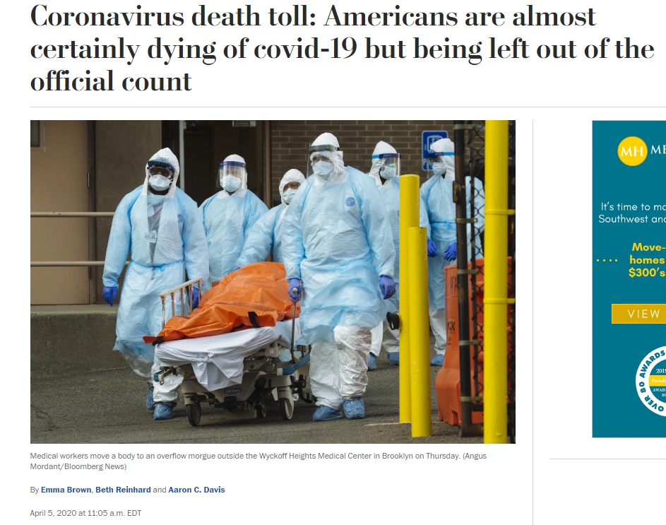 截至4月6日下午,美国因新冠肺炎致死的人数已经过万。但《纽约时报》、《华盛顿邮报》等美国主流媒体4月5日均报道称,由于检测比率低、统计落后、各州标准不一等原因,美国的新冠肺炎实际死亡人数其实被低估了。