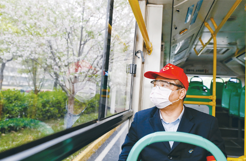 2020年3月25日,在武昌火车站综合体站始发的首趟518路公交车上,安全员熊伟望着窗外路边的樱花。当日起,武汉市部分公交车恢复开行。 新华社记者 沈伯韩/摄