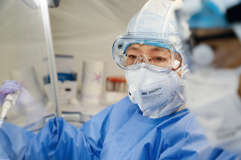 中国工程院院士、军事医学研究院研究员陈薇,曾在阻击非典、抗击埃博拉等多场硬仗中作出重要贡献。今年农历正月初二,她就带领专家组紧急进驻武汉,全力进行科研攻关。2020年3月16日,陈薇团队研制的重组新冠疫苗获批进入临床试验。图为陈薇在临时搭建的帐篷式移动实验室做检测。 央广军事记者 张振威/摄