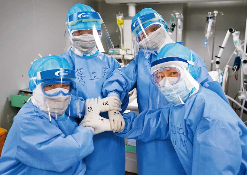 在抗击新冠肺炎疫情的最前沿“红区”,白衣天使们打赢了一场场与病毒的“生死战”。图为2020年3月20日,武汉火神山医院重症医学一科的护士们合影为武汉加油。 新华社记者 王毓国/摄