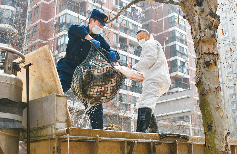 2020年3月13日,一批运到武汉社区的活鱼正在卸货。当日,首批100吨调配自湖北省咸宁市的活鱼运抵武汉市硚口区11个街道下辖社区。 新华社记者 程敏/摄