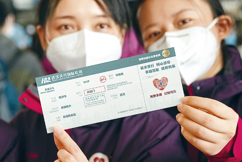 广大医务工作者是这次战“疫”的“最大的功臣”。新冠肺炎疫情发生以来,29个省区市和新疆生产建设兵团、军队等调派340多支医疗队、42000多名医务人员紧急驰援湖北。随着防控形势逐步向好,首批支援湖北国家医疗队于2020年3月17日踏上返程之路。图为两名国家紧急医学救援队队员展示武汉天河机场特别准备的“胜利号”登机牌。 新华社记者 熊琦/摄