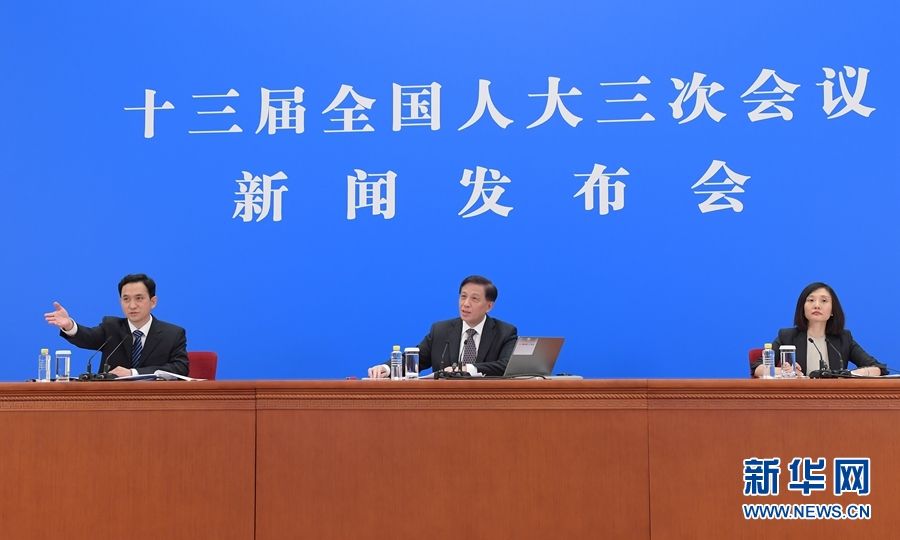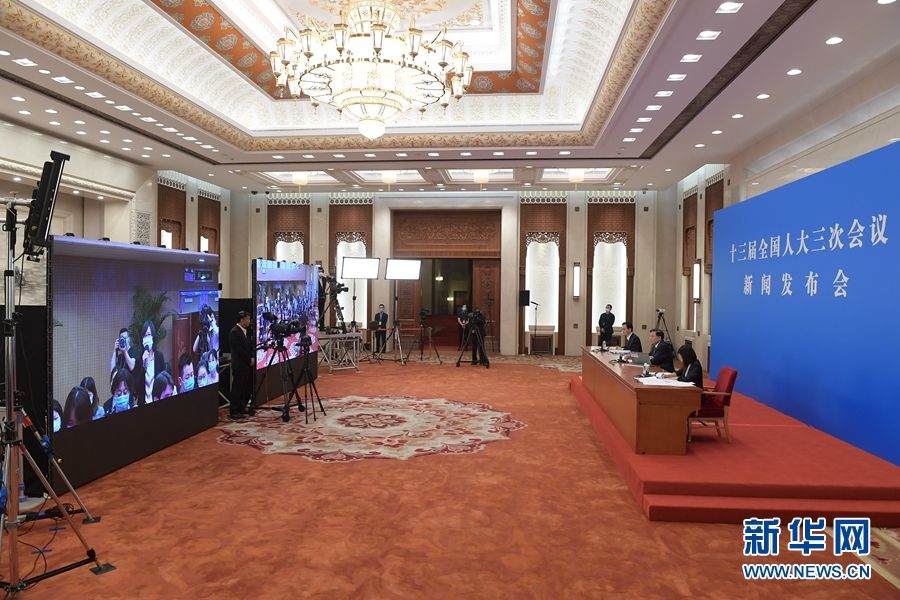 5月21日,十三届全国人大三次会议新闻发布会在北京人民大会堂新闻发布厅举行,由大会发言人张业遂就大会议程和人大工作相关问题回答中外记者提问。为有效防控疫情,共同维护公共卫生与健康,新闻发布会采用网络视频形式进行。 新华社记者 李贺 摄