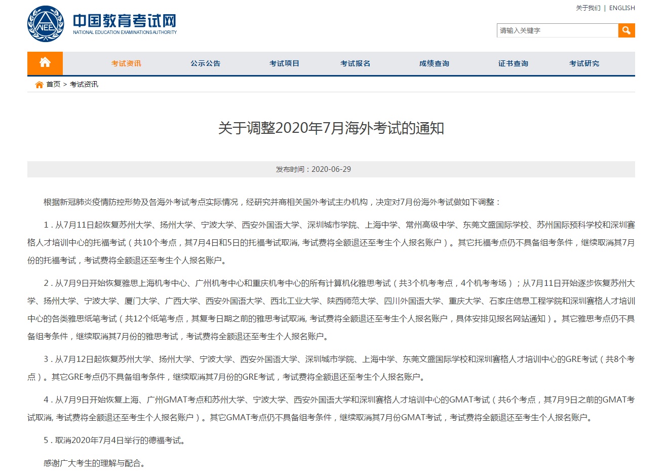 据教育部考试中心,根据新冠肺炎疫情防控形势及各海外考试考点实际情况,经研究并商相关国外考试主办机构,决定对7月份海外考试做如下调整: