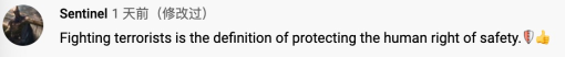 网友 Sentinel 评论道:“打击恐怖主义对于保障人民人权和生命安全来说是最基本的底线。”
