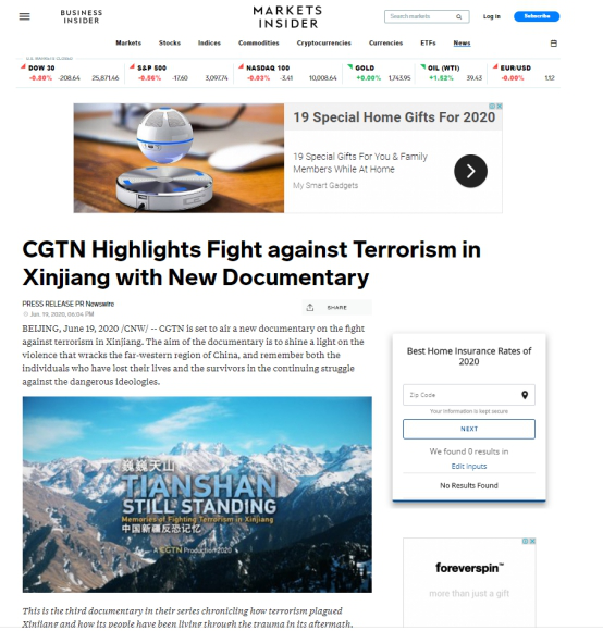 该片一经播发,便引起海外媒体高度关注。截至目前,共有美国、英国、德国、葡萄牙、意大利、西班牙、澳大利亚、瑞士、墨西哥、巴西、阿根廷、韩国、印度、马来西亚等多达27个国家和地区的475家主流外媒转发了CGTN官网相关内容,浏览量达1.55亿。雅虎财经、道琼斯市场观察、福克斯、市场洞察、意大利国际通讯社、华尔街在线、晨星网、澳大利亚联合通讯社、巴西记者专站、加拿大洞察、哥伦比亚华纳兄弟联合电视网、印度亚洲通讯社等媒体进行转载,反响热烈。