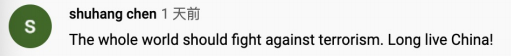 网友shuhang chen评论道:“全世界都应该打击恐怖主义。中国万岁!”