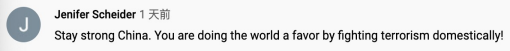 网友 Jenifer Scheider 评论道:“加油中国。你们在国内打击恐怖主义,也是帮了世界一个大忙!”