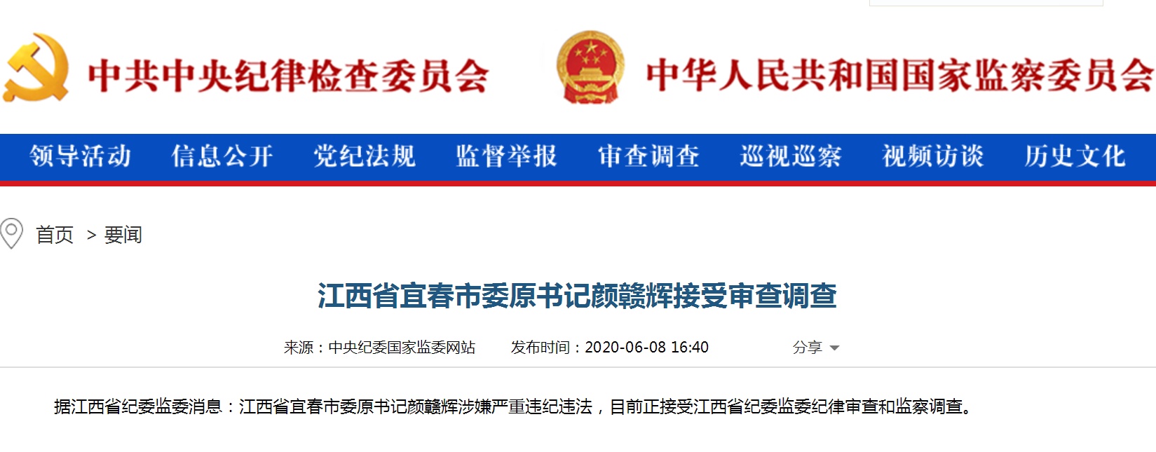 据江西省纪委监委消息:江西省宜春市委原书记颜赣辉涉嫌严重违纪违法,目前正接受江西省纪委监委纪律审查和监察调查。