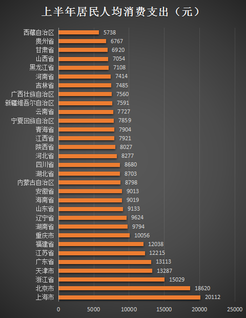 从统计数据来看,上半年上海人均消费支出突破2万元,北京、浙江、天津、广东、江苏、福建、以及重庆8地位于1万元阶梯,其余22地人均消费支出均处于万元以下。