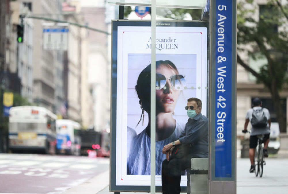 7月8日,一名男子在纽约第五大道的公交车站等车。新华社记者王迎摄
