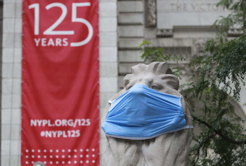 这是7月8日在美国纽约公共图书馆前拍摄的“戴”口罩的石狮子。新华社记者 王迎摄