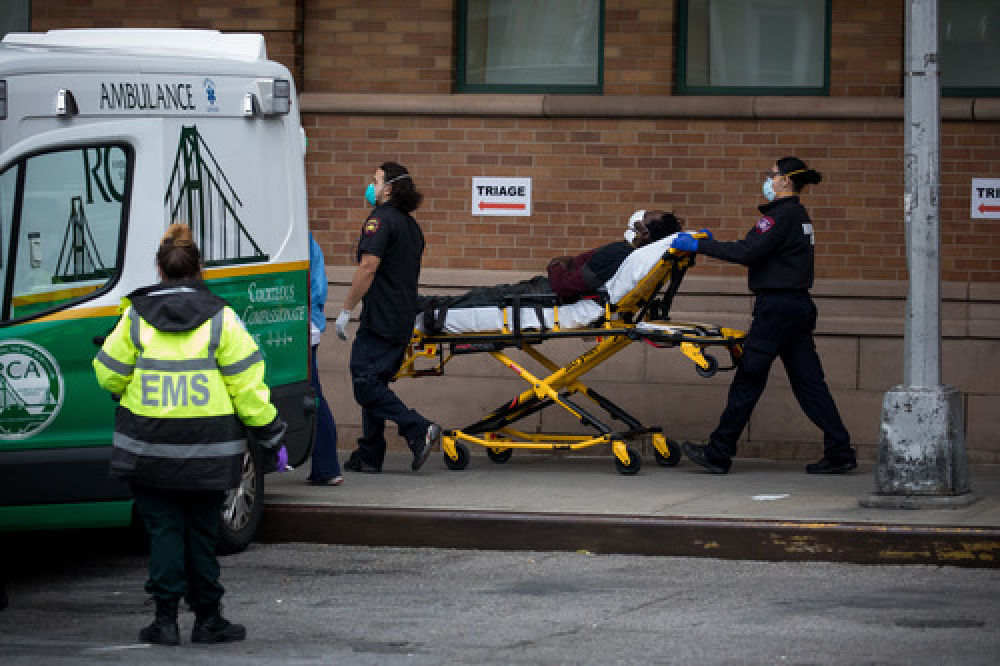 4月19日,在美国纽约一家医院,医护人员运送病人。新华社发(郭克摄)