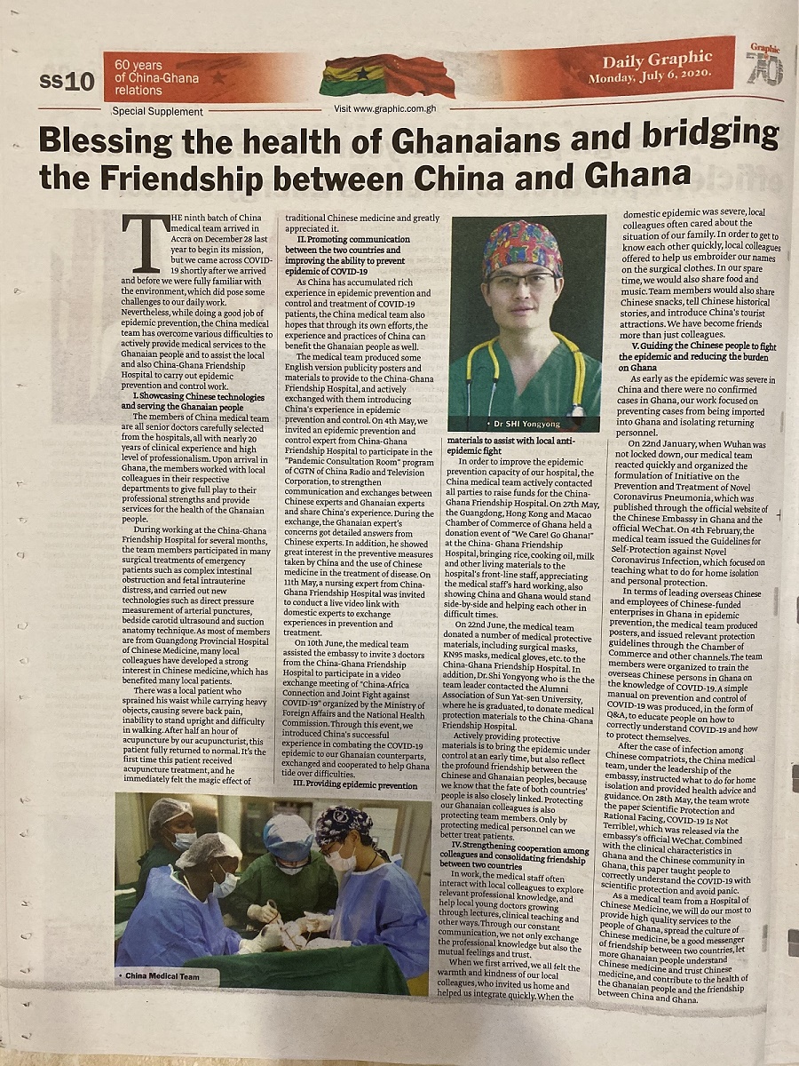 中加建交60周年之际,加纳第一大报《每日写真报》于7月6日刊文报道了中国第九批援加纳医疗队加强中加医疗合作,帮助当地抗击疫情的事迹。