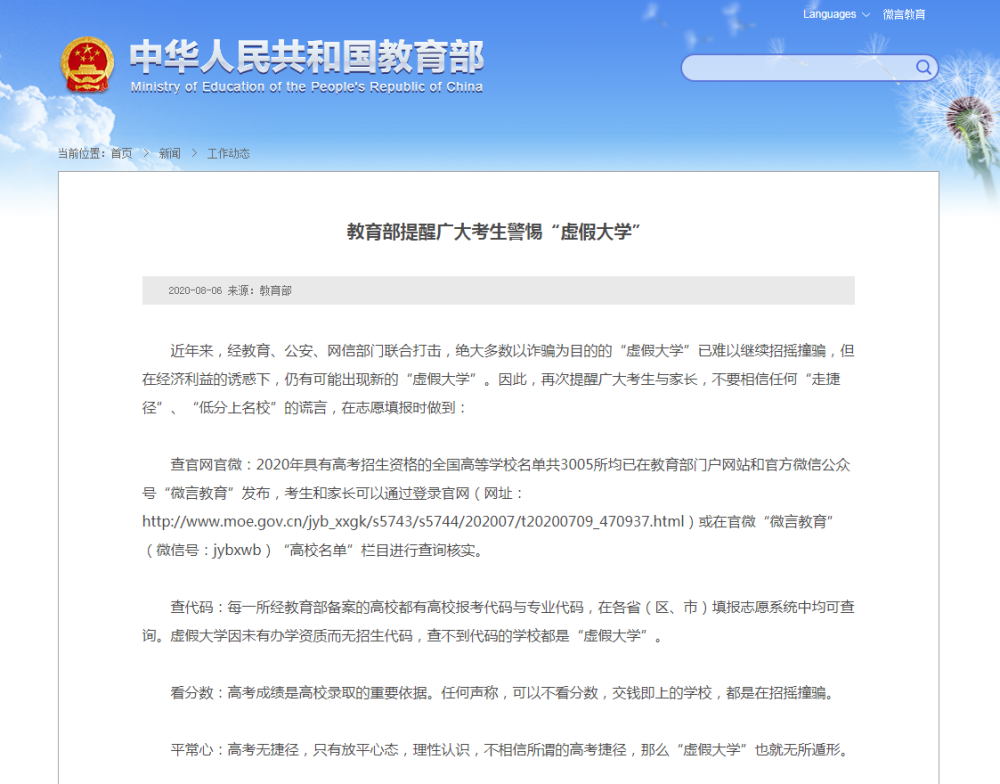 查官网官微:2020年具有高考招生资格的全国高等学校名单共3005所均已在教育部门户网站和官方微信公众号“微言教育”发布,考生和家长可以通过登录官网(网址:http://www.moe.gov.cn/jyb_xxgk/s5743/s5744/202007/t20200709_470937.html)或在官微“微言教育”(微信号:jybxwb)“高校名单”栏目进行查询核实。