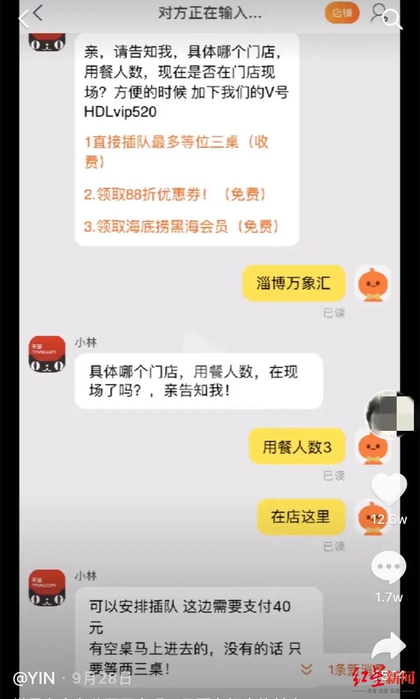 根据用户@YIN所说,在淘宝上搜索“海底捞免排队或插队”即可插队。记者也联系上一家名叫“林儿小店店”的淘宝店铺,在记者表示需要购买插队服务时,客服表示“到店后等1~2桌即可”。