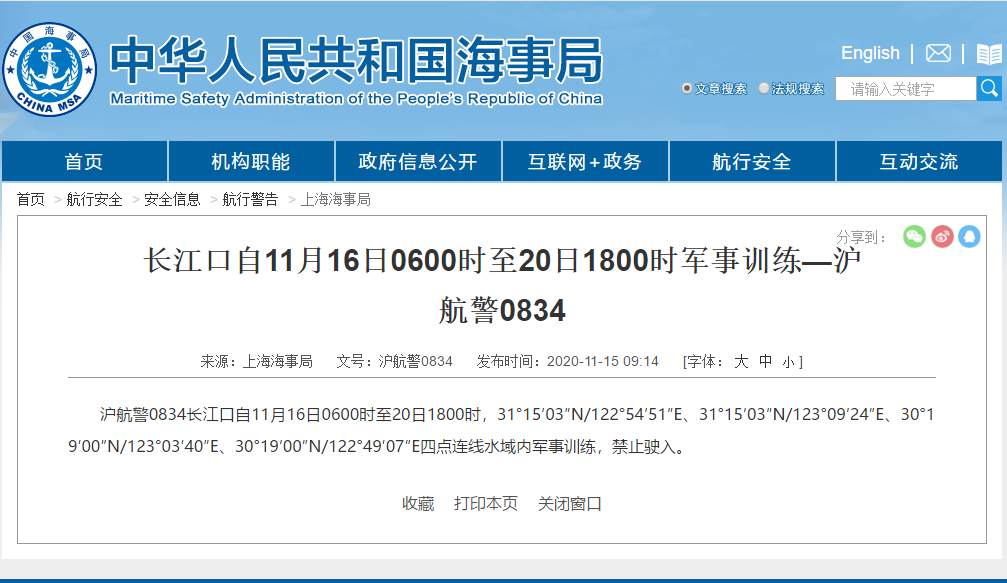 沪航警0834长江口自11月16日0600时至20日1800时,31°15′03″N/122°54′51″E、31°15′03″N/123°09′24″E、30°19′00″N/123°03′40″E、30°19′00″N/122°49′07″E四点连线水域内军事训练,禁止驶入。