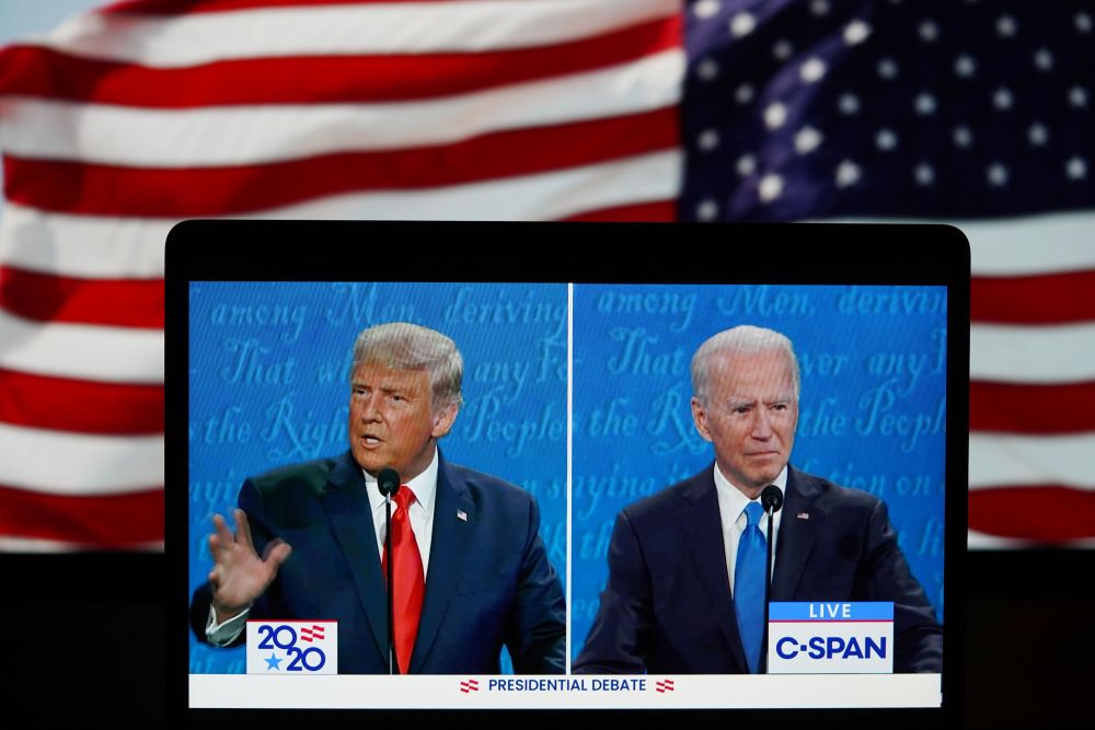 这张10月22日在美国弗吉尼亚州阿灵顿拍摄的视频画面显示,美国总统特朗普(左)与民主党总统候选人拜登在参加最后一场总统候选人电视辩论。(新华社记者刘杰摄)
