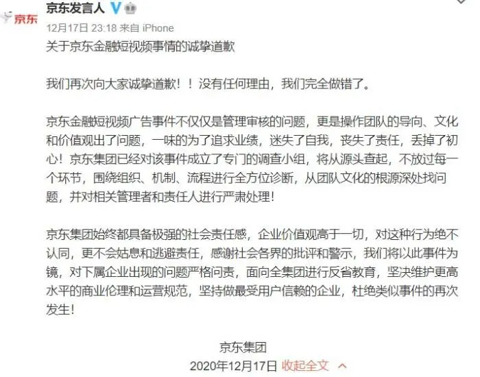 近日,一则毁三观的“土味”借贷广告将京东金融推上风口浪尖,为此,短短三日内,京东金融、京东集团先后道歉。