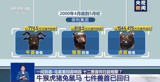 首先是2000年4月底到5月初,牛首、猴首和虎首铜像分别现身香港佳士得和香港苏富比拍卖会。当时,这两家公司拍卖流失文物的做法,引起了香港和内地社会各界的极大愤慨。最终保利集团以774.5万元港币拍得牛首,以818.5万元港币拍得猴首,而虎首则以1544.475万元港币成交。