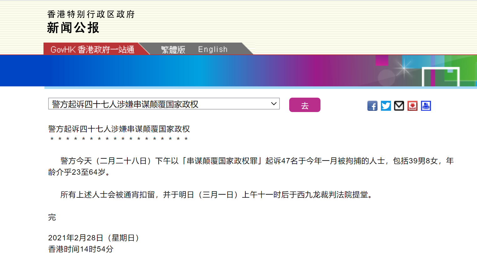 据香港“星岛网”报道,55名反对派人士参与所谓“35+初选”,被控涉嫌违反香港国安法,他们早前陆续接获警方通知,须提前于今日下午2点到全港各区多个警署报到。警方下午以“串谋颠覆国家政权罪”起诉当中47人,包括39男8女,年龄介于23至64岁。各人被通宵扣留后,明日(3月1日)上午11时后在西九龙裁判法院提审。