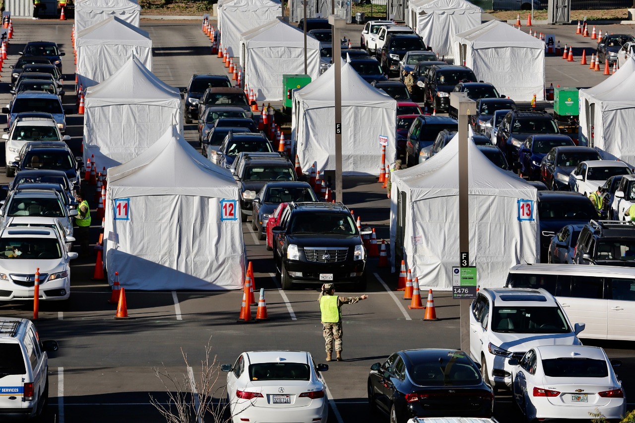 2月22日,民众驾车来到美国加州大学洛杉矶分校的一处疫苗中心准备接种新冠疫苗。(新华社发)