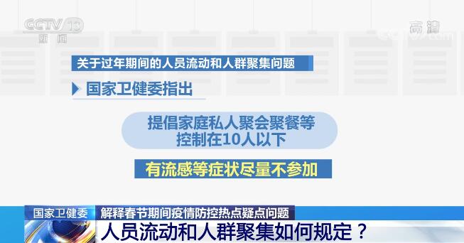 关于过年期间的人员流动和人群聚集问题。国家卫生健康委指出,企事业等单位举办会议、聚会等活动应当控制人数,50人以上活动应当制定防控方案;提倡家庭私人聚会聚餐等控制在10人以下,有流感等症状尽量不参加。农村地区,要求居民家庭不举办聚餐等聚集性活动,劝导农民群众不串门、不聚集、少外出,提倡“喜事缓办,丧事简办,宴会不办”。确需举办的活动,规模应控制在50人以下并有防控方案,要向属地疫情防控指挥部报批,由村委会负责监督登记并严格执行防控措施。