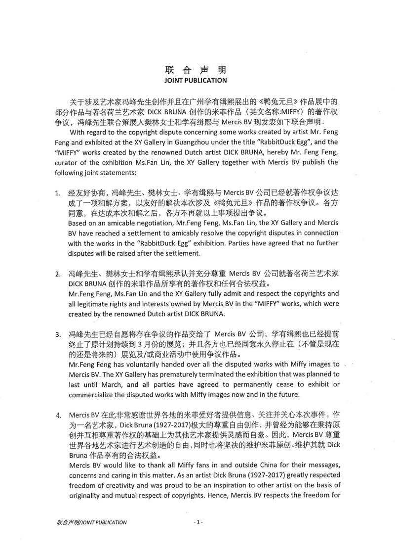 “声明”显示,艺术家冯峰已经自愿将存在争议的作品交给“米菲兔”版权方Mercis BV公司,展览主办方学有缉熙美术馆也提前终止了原计划持续至3月份的展览,并且各方已经同意永久停止在未来的展览及商业活动中使用争议作品。