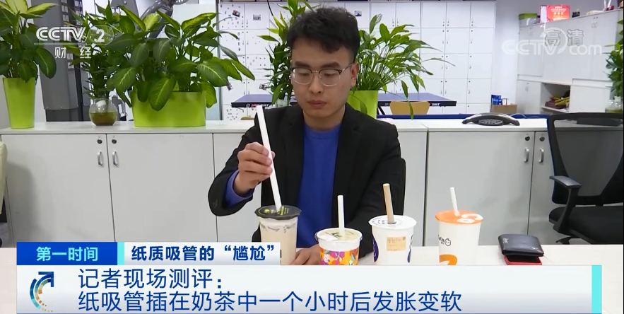 针对纸吸管使用体验不好的情况,记者也对一些奶茶店的吸管做了一个对比测评,结果怎么样?
