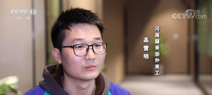 河南籍来浙外来工 高雷明:就是今年回家过年的人数比往年是明显少了很多,今年只有六个人回家过年,往年就是二三十人回家过年的,所以说这个人员、产能也是充足的。因为我们是一直在十二小时两班倒的这样一个运转。