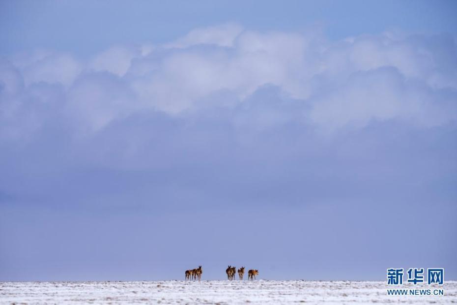 4月20日,一群藏羚羊向卓乃湖方向行进。近日,可可西里迎来降雪,大量藏羚羊汇聚在可可西里五道梁地区,踏上迁徙之路。新华社记者 费茂华 摄