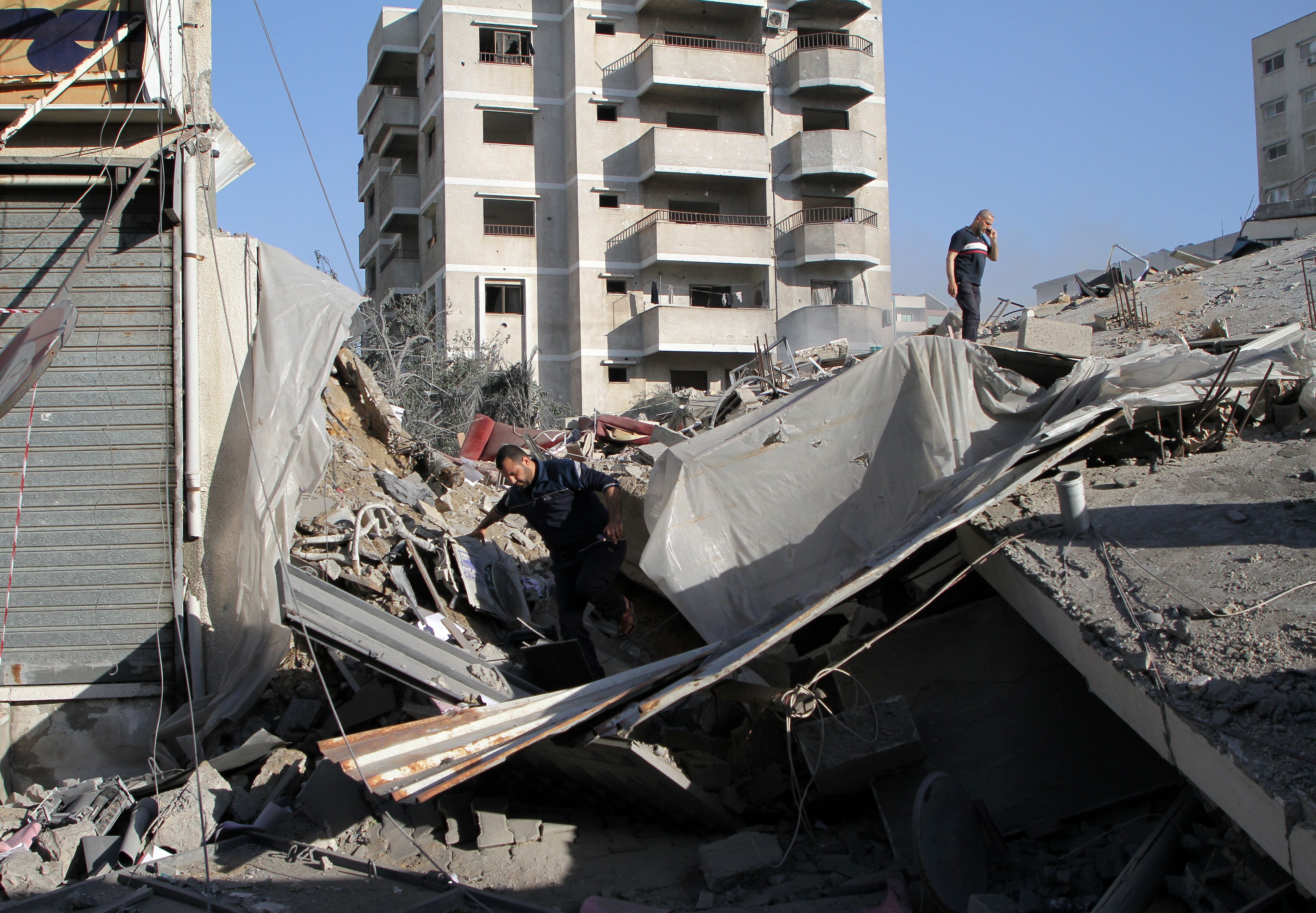 5月14日,巴勒斯坦人在加沙城查看被以军空袭摧毁的一处哈马斯银行废墟。(新华社发,里泽克·阿卜杜勒·贾瓦德摄)